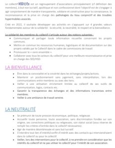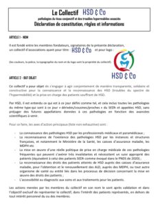 Ce collectif a pour objet de s’engager à agir conjointement de manière transparente, solidaire et constructive pour la connaissance et la reconnaissance des HSD (Troubles du Spectre de l’Hypermobilité) et la prise en charge des patients souffrant de HSD.